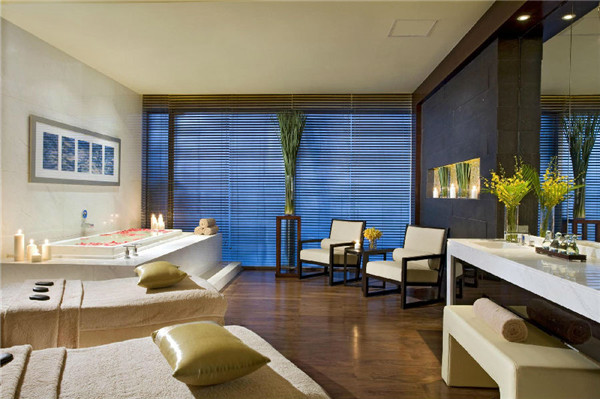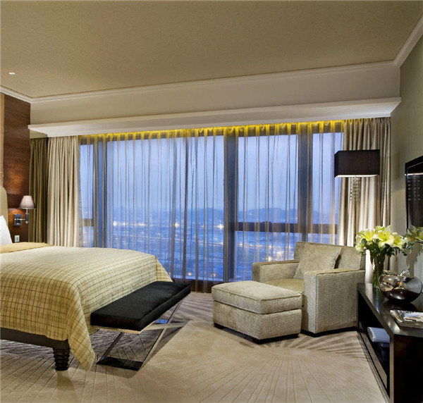 酒店是一家五星级的商务型酒店,拥有全新装修的各类客房412间(套),1210平方米的国际会议中心酒店集客房、中西美食、商务会议、娱乐购物于一体。在选择窗帘面料的时候考虑到了办公的一个严谨和功能性以及酒店的一个休闲性。酒店会议室以单一冷色系为主,以保持商务会议的严谨性和私密性,客房以暖色调为主,搭配不同的装修风格,以渲染舒适和谐的居住环境,让顾客有一种宾至如归的感觉。